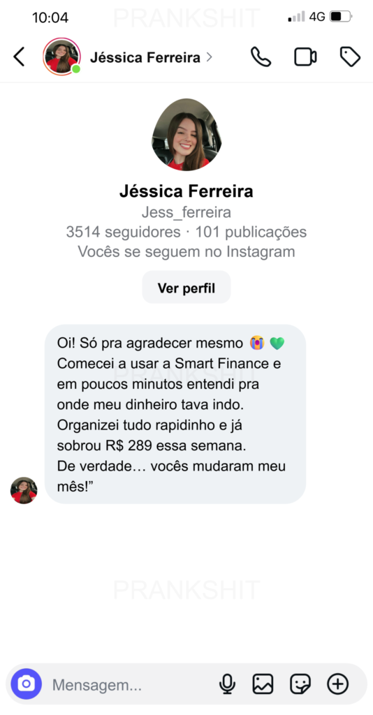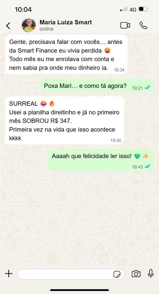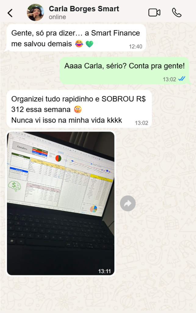A Smart Finance foi pensada para caber na sua rotina. Em poucos minutos por semana você atualiza seus gastos e já tem clareza total de quanto entrou, quanto saiu e quanto realmente sobrou no mês.